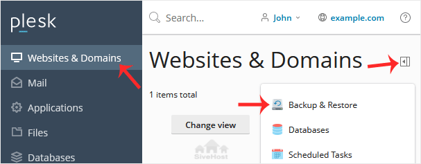 2. Go to Websites & Domains > Click on the Pull icon >> Choose Backup & Restore.